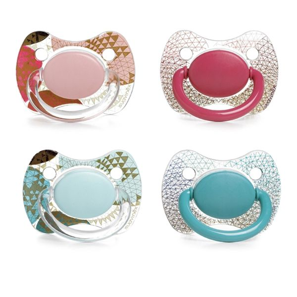 El chupete Suavinex Premium Fisiolo +4M está fabricado en silicona médica, un material blando que no absorbe olores ni sabores, ni varía en la forma. Este chupete está avalado por la Sociedad Española de Odontopediatría. Te sorprenderá su transparencia y tonos dorados, que logran un conjunto único y con personalidad propia, combinado con el broche Haute Couture cromado en oro. Disponible en diversos diseños a juego con el broche pinza Haute Couture.