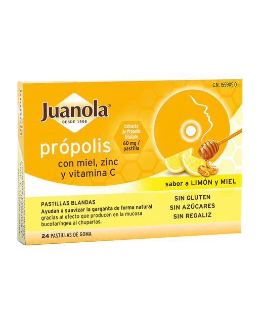 Juanola própolis + hedera con miel, zinc y vitamina C son unas pastillas blandas que combinan el efecto del extracto de própolis (60 mg/pastilla), la miel (10 mg/pastilla), el zinc (0,8 mg/pastilla) y la vitamina C (6 mg/pastilla), para suavizar la garganta gracias al efecto que producen las pastillas en la mucosa bucofaríngea al chuparlas.
